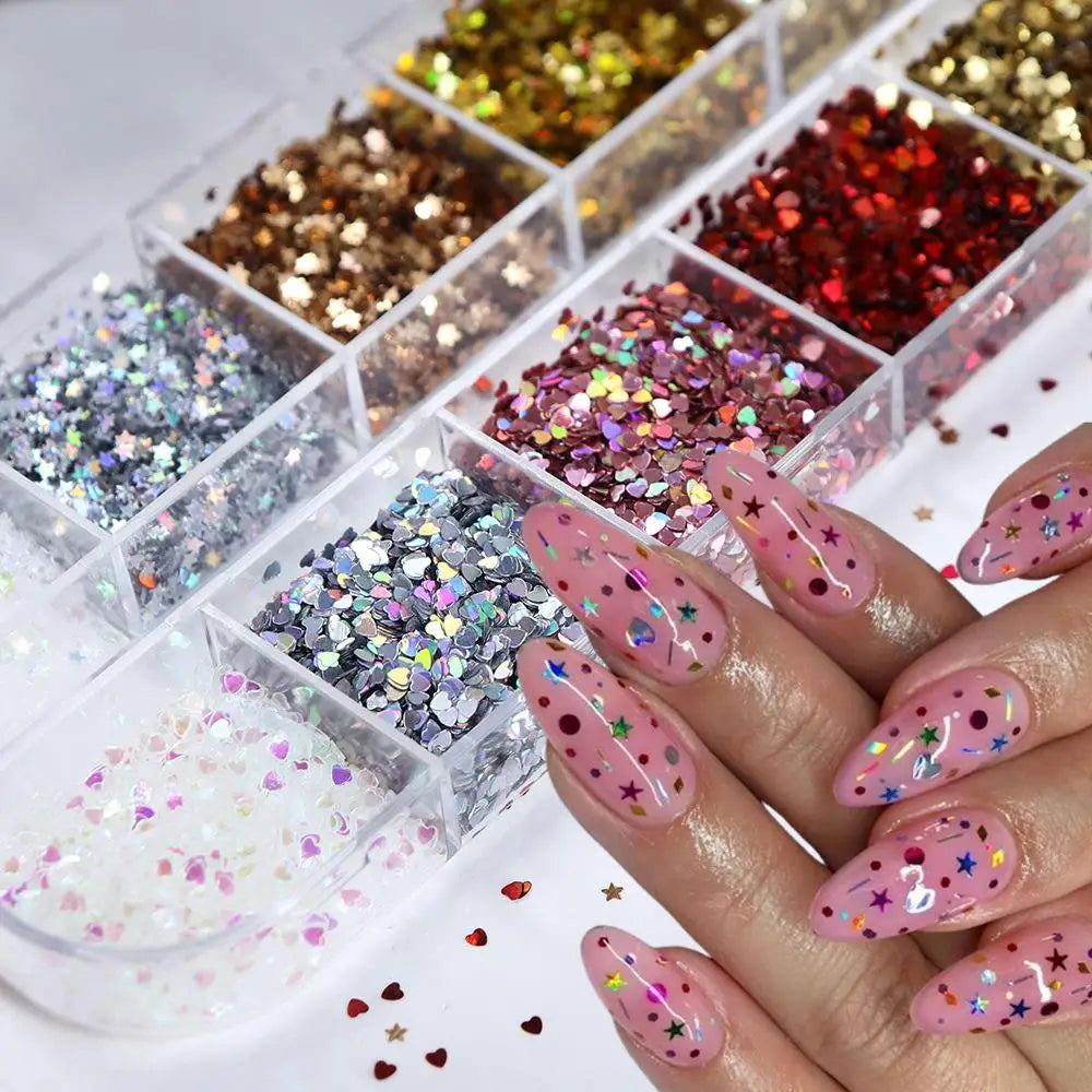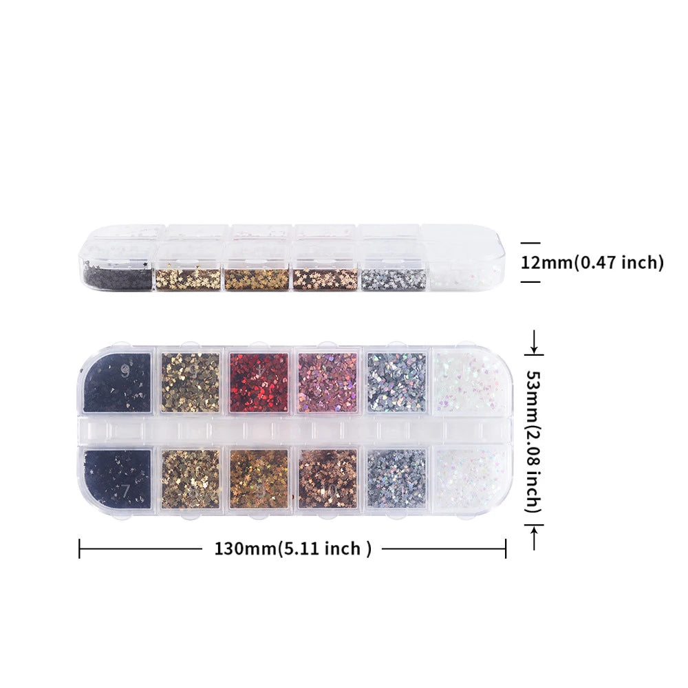 12Grids 3D Mini Heart/Star Nail Glitter Sequins 1mm Holographic Love Pentagram Flakes Sparkling Nail Art Decorations Paillettes